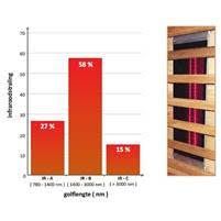 Full-spectrum stralers worden vaak gebruikt voor medische en therapeutische doeleinden, voornamelijk voor de verlichting van spier- en gewrichtspijn. Deze stralers zenden infraroodstraling uit in het volledige spectrum (IR-A, IR-B en IR-C), waarbij de korte golfstraling het diepst doordringt. Omdat deze straling krachtiger is, kunt u per sessie maximaal 30 minuten in de sauna blijven. Een bijkomend voordeel van full-spectrum stralers is dat ze direct te gebruiken zijn zonder opwarmtijd.
